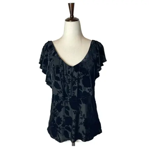 This blouse from 1. State is in excellent condition. It is in an allover floral print in black color in velvet fabric. It features; V-neckline with ruffled trim, v-back, short slit sleeves, straight hemline with pullover styling, lined and is crafted from polyester, nylon and spandex blend materials.