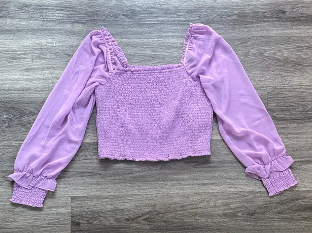 Elegant lavender blouse with smocked detail. Features long sleeves with ruffle cuffs. P16” L18” Exc... Show more