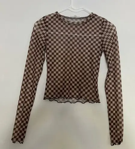 Trendy 12th Tribe mesh top in a brown and tan checkerboard print. Women’s size Small. Features long... Show more