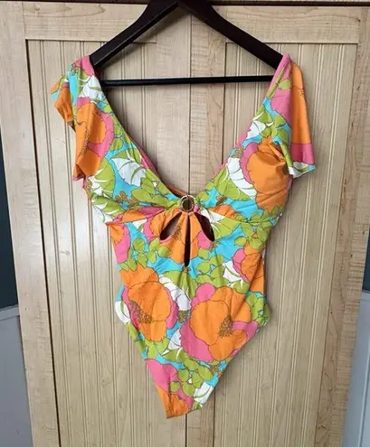 The product is a designer Trina Turk one-piece swimsuit in size 14, featuring a vibrant floral patte... Show more