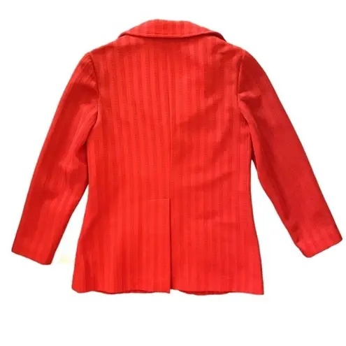 Tailored single-breasted blazer with striped texture. Three-button closure. Textured gold-tone buttons. Long-sleeved. Ends below hip. Vent in back. No material tag - feels like polyester. Great vintage condition. No holes, stains, or odors. See all pics. Vintage size 14 - fits like Medium/Large Bust: 37" Waist: 35" Hip: 42" Length: 27" Sleeve: 29"