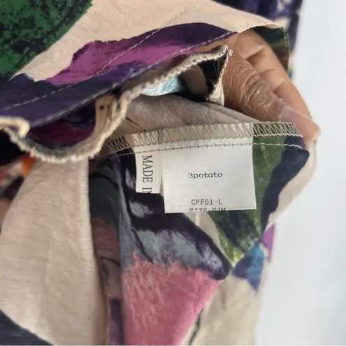 3 Potato Lagenlook Art To Wear Colorful Abstract Button-Up Dolman Tunic Size S/M Vibrant button-up shirt with an abstract design. Features a mix of colors including red, orange, green, blue, and purple. Perfect for a bold fashion statement. oversized fit button front 3/4 dolman sleeves high low hem semi sheer lightweight fabric pockets lagenlook artsy 2532