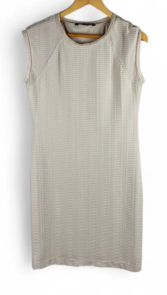 Sharagano Sleeveless Textured Sheath Dress - Size 12, Beige Elegant Sharagano sleeveless sheath dress in a versatile beige hue. The textured fabric adds a sophisticated touch, making it perfect for both professional settings and special occasions. • Brand: Sharagano • Size: 12 • Color: Beige • Material: 95% Polyester, 5% Spandex Features: • Sleeveless design • Textured fabric for added style • Sheath silhouette • Hidden back zipper closure • Fully lined for comfort Measurements (approximate): • Bust: 18.5 inches (lying flat) • Length: 39 inches (shoulder to hem) Care Instructions: Machine washable; tumble dry low. Keywords: Sharagano dress, sleeveless sheath, textured dress, size 12, beige dress, women’s fashion, elegant dress, workwear, cocktail dress.