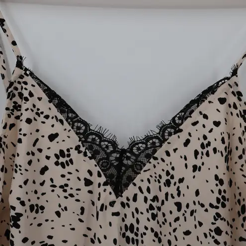 Brand new midi slip dress featuring a chic black-on-cream abstract animal print and delicate lace-tr... Show more