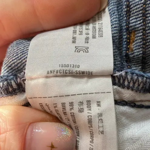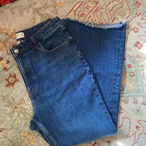 A&F Vintage Flare High Rise Jeans Curve Love. Dark blue wash, raw hem. 99% cotton 1% elastane. Excel... Show more