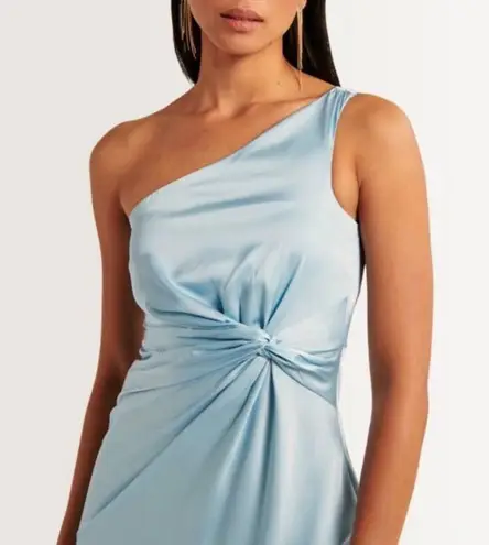 Slim-fitting one-shoulder midi dress in our elevated, shiny satin fabric, featuring an asymmetrical neckline, on-trend drapey knot detail at the waist, and a thigh-high slit detail. Imported.