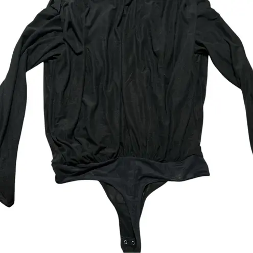 “Slim-fitting long-sleeve bodysuit in our soft lurex fabric, with draping details down the bodice, deep-V neckline and two-snap bottom closure.”