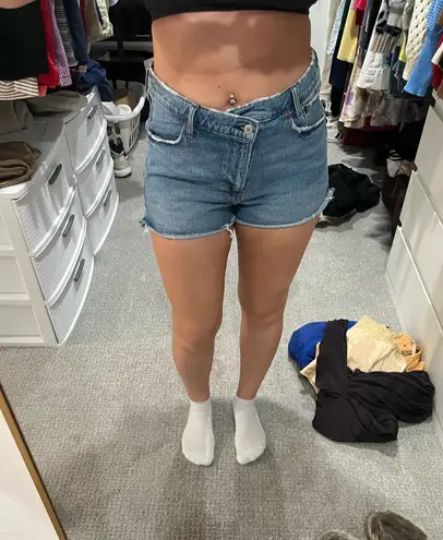 Size 30 / 10 Reg High-Rise The Mom Short Mid Weight Denim Crossover Waist Frayed Hem Bottoms are sl... Show more
