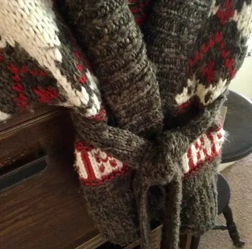 Stylish cardigan by Abercrombie & Fitch. Features intricate red and white designs. Ideal for cozy w... Show more