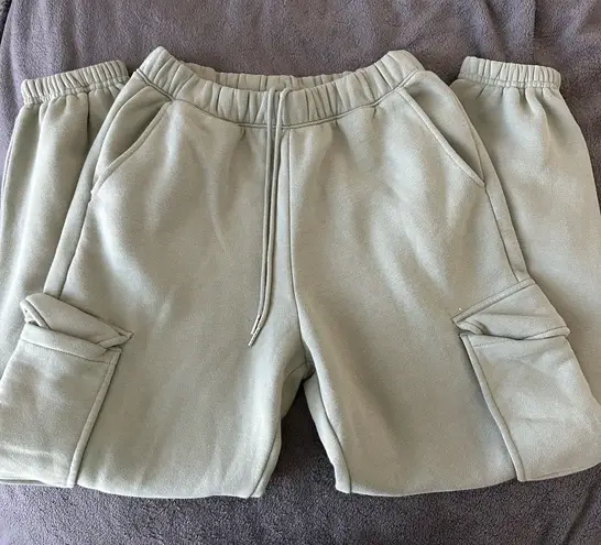 Olive jogger pants with elastic waistband. Casual and comfortable style.