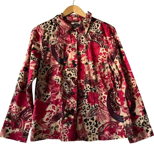 Additions by Chico's Floral Paisley Leopard Print Button Down Top Jakcet Sz 2 Measurements: • Pit... Show more