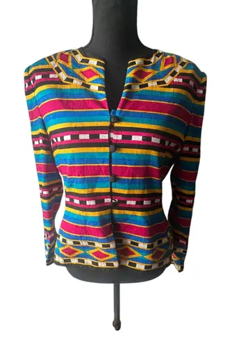 Make a bold statement with this Adrianna Papell 100% silk blazer featuring vibrant stripes, a struct... Show more