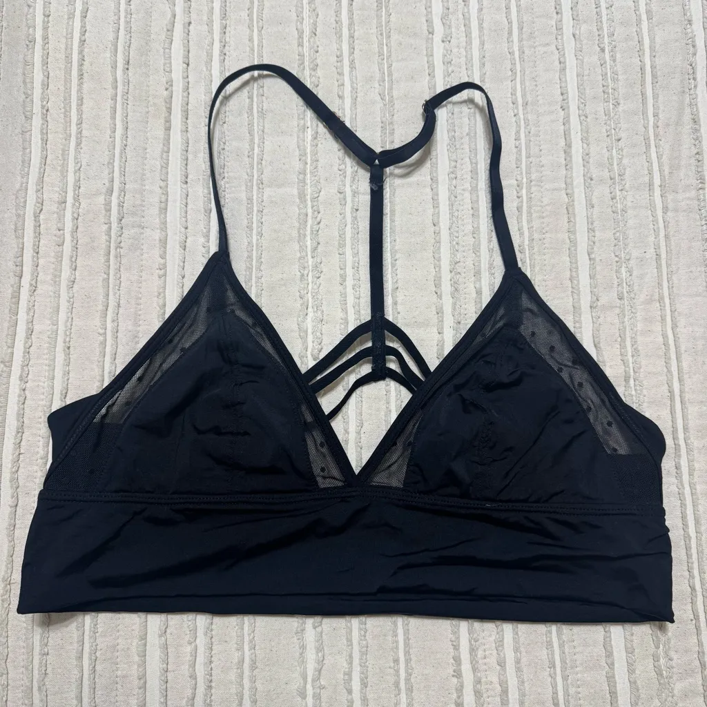 Chic black bralette with mesh accents. Strappy design for modern style.