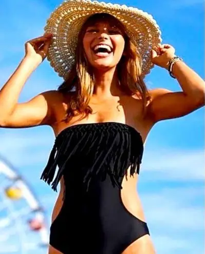 Perfect condition! Aerie black strapless bathing suit with fringe detail. Ties in the back Measureme... Show more