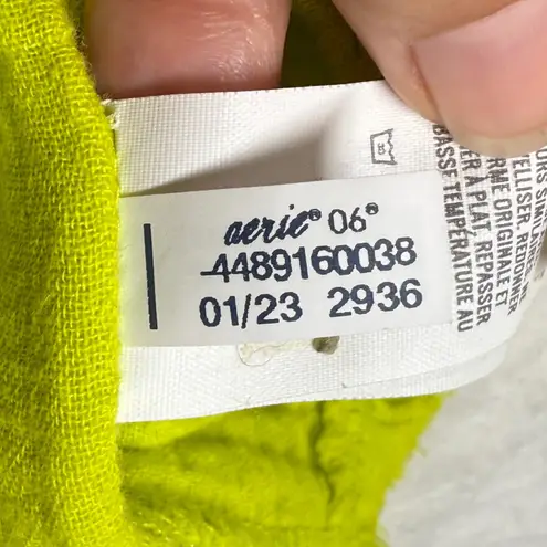 Keywords: Aerie, button down shirt, gauze top, raw hem, long sleeve, chartreuse, green, casual top, boho, bohemian, festival, cotton, blouse, women's top, pool-to-party coverup, resort wear, loungewear, swim coverup, beachy, beach, coastal