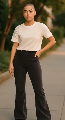 Effortless chic in a pair of corduroy flare leggings. These sleek, pull-on pants offer a comfortable and flattering fit, perfect for adding a touch of retro flair to your everyday style. The soft corduroy texture provides a unique and cozy feel, while the flared leg creates a stylish and elongated silhouette. Dress them up with a blouse and heels for a night out, or keep it casual with a tee and sneakers for a relaxed weekend vibe. Ideal for running errands, grabbing coffee with friends, or lounging at home in comfort and style.