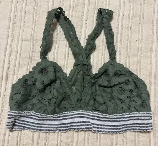 Chic olive lace bralette with a stylish striped accent. Ideal for layering.