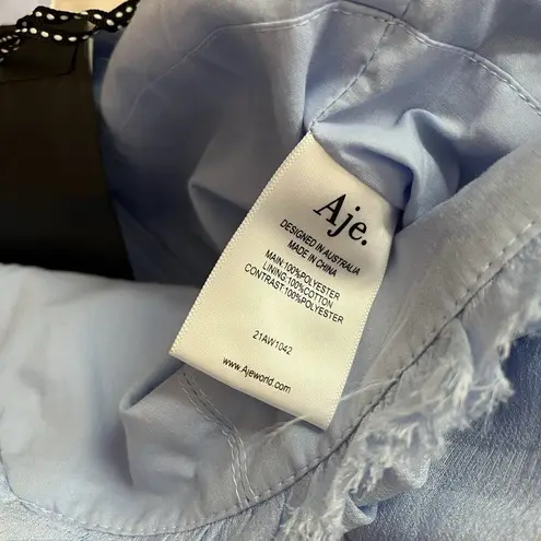 Aje. NWT Divine Off-the-shoulder Organza Top In Light Blue Size 8 $395 retail Off-the-shoulder top Organza Grosgrain trims Raw-cut trims Ruffled Buttoned cuffs Concealed hook and zip fastening at back Fully lined Mid-weight, non-stretchy fabric Polyester. Dry clean only There is a small snag on the sleeve 14759