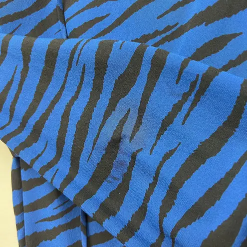 NWT ALC Kirk Top in Blue/Black Size 4 New with tags. Has some staining on sleeve as seen in last photo. Approximate measurements laying flat: Length: 26". Chest: 18.5". Lightweight non-stretch fabric 92% Silk / 8% Elastane Dry clean only Zebra print V-neck Pullover style 1232 B5