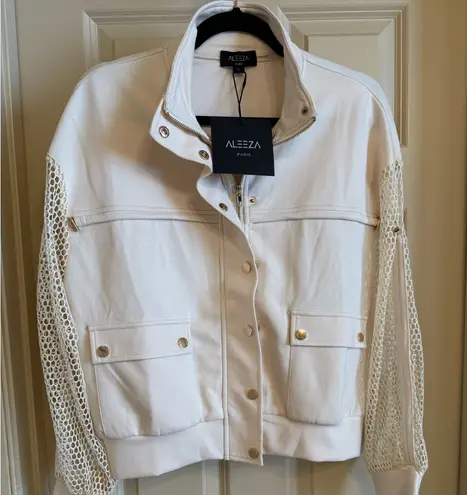 Discover elegance with the Aleeza Women's Bomber Jacket. This cream jacket features unique mesh sleeves, adding a touch of sophistication to your wardrobe. Perfect for versatile styling.