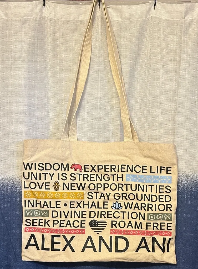 Canvas tote with motivational words. Features long straps for easy carrying.