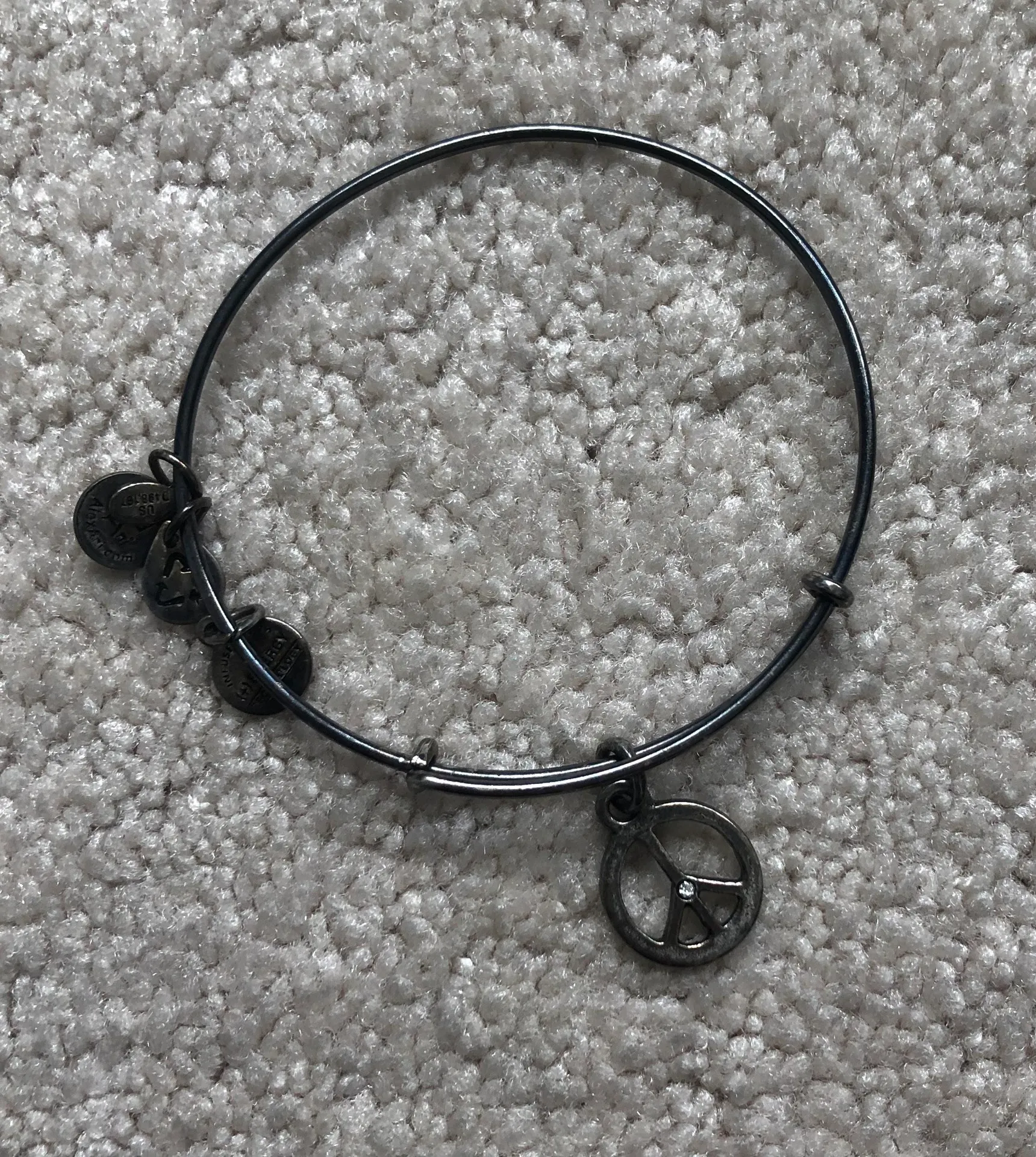 Gun metal peace sign charm bangle with small gem in the middle from Alex and Ani. Tarnish is shown i... Show more