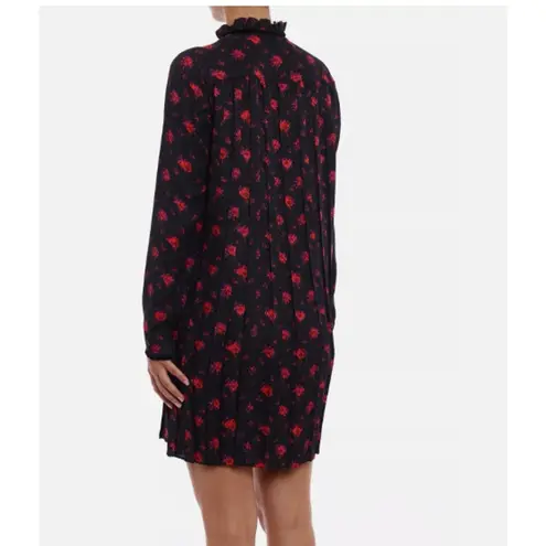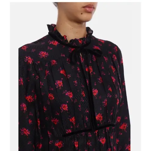 The image shows a black long-sleeve midi dress with red floral print, identified as a McQ Alexander McQueen dress. It features a high, frill-trimmed neckline with a velvet tie, long sleeves, and a pleated skirt with a velvet waistband. The dress is made of silk and has a black base with an all-over red floral pattern Size IT 40 = US10 100% Silk Length from the top the shoulder down the back is 35 inches. Tags: British-inspired, edgy, and gothic designs, whimsy goth