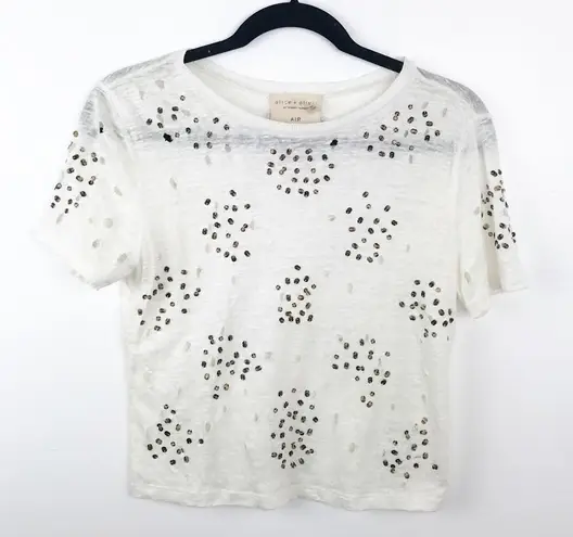 Alice + Olivia sequin distressed linen white tee semi cropped Size medium, in excellent condition wi... Show more