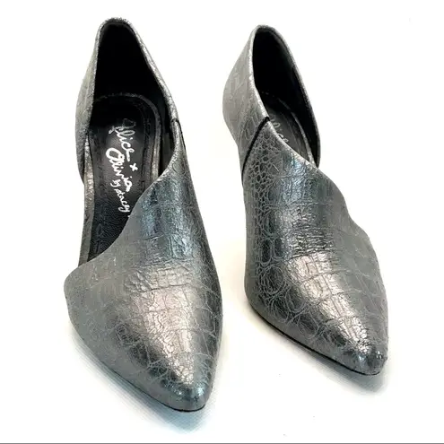 ALICE + OLIVIA LEATHER, PEWTER CROCODILE-EMBOSSED HALF CUT VAMP, STILETTO HEEL BOOTIES. THE SHOES H... Show more