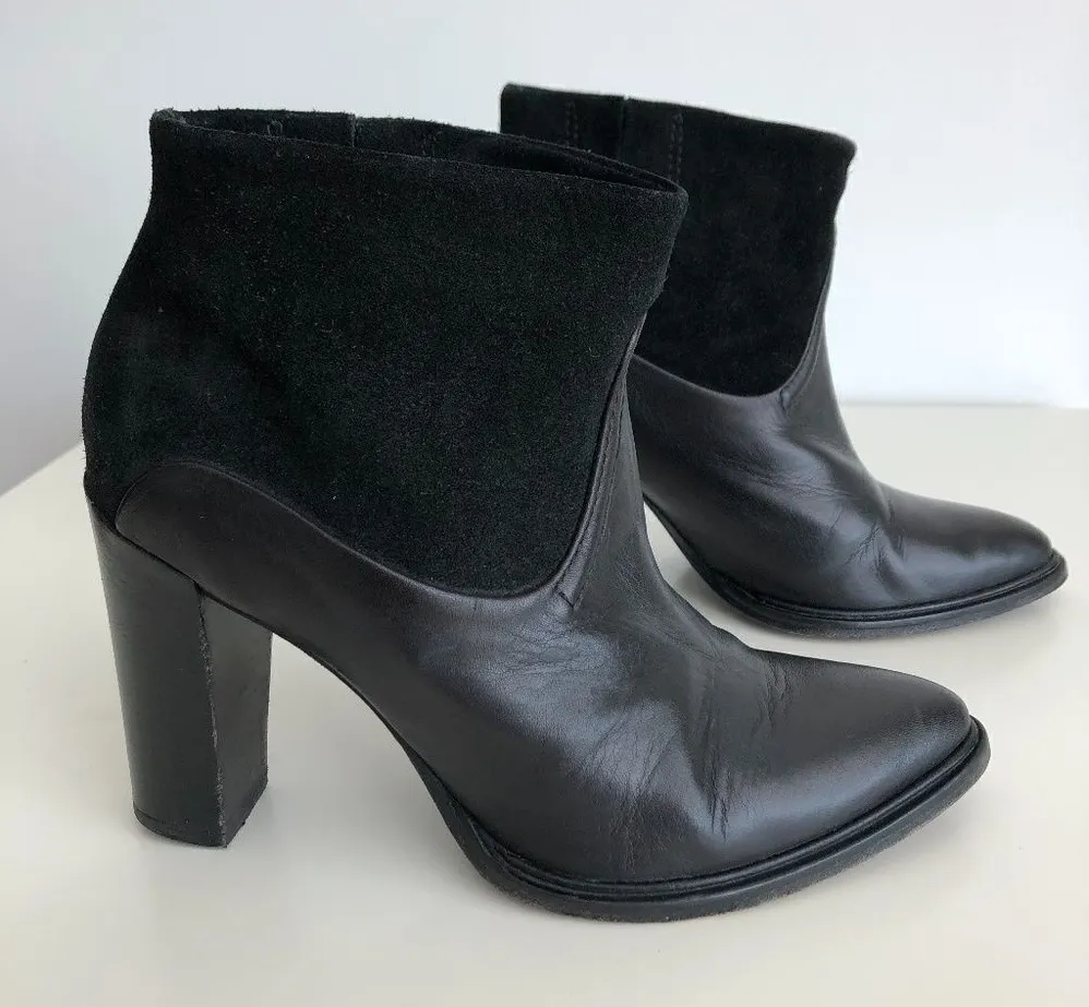 Black suede and leather two tone AllSaints pointed-toe ankle boots with tonal stitching and stacked heels. Gently preloved condition. Shows some signs of wear, including scuffing at sole 4'' Heel 5.5” shaft 10.5” opening Size 37 which are equivalent to a US size 6 in All Saints Sizing #BX2