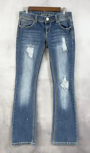 Features: Bootcut leg, distressed front patches, rhinestone and embroidery embellished back pockets, contrast stitching, low rise fit, zipper fly with button closure, five-pocket design, stretch blend fabric