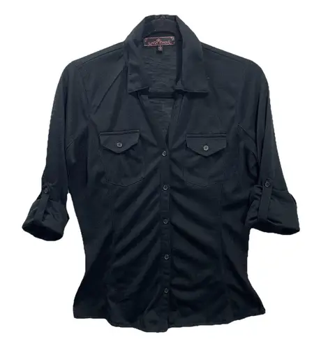 The Almost Famous Women's Black Plaid Bottom Up Blouse in size Large is a stylish and versatile addi... Show more