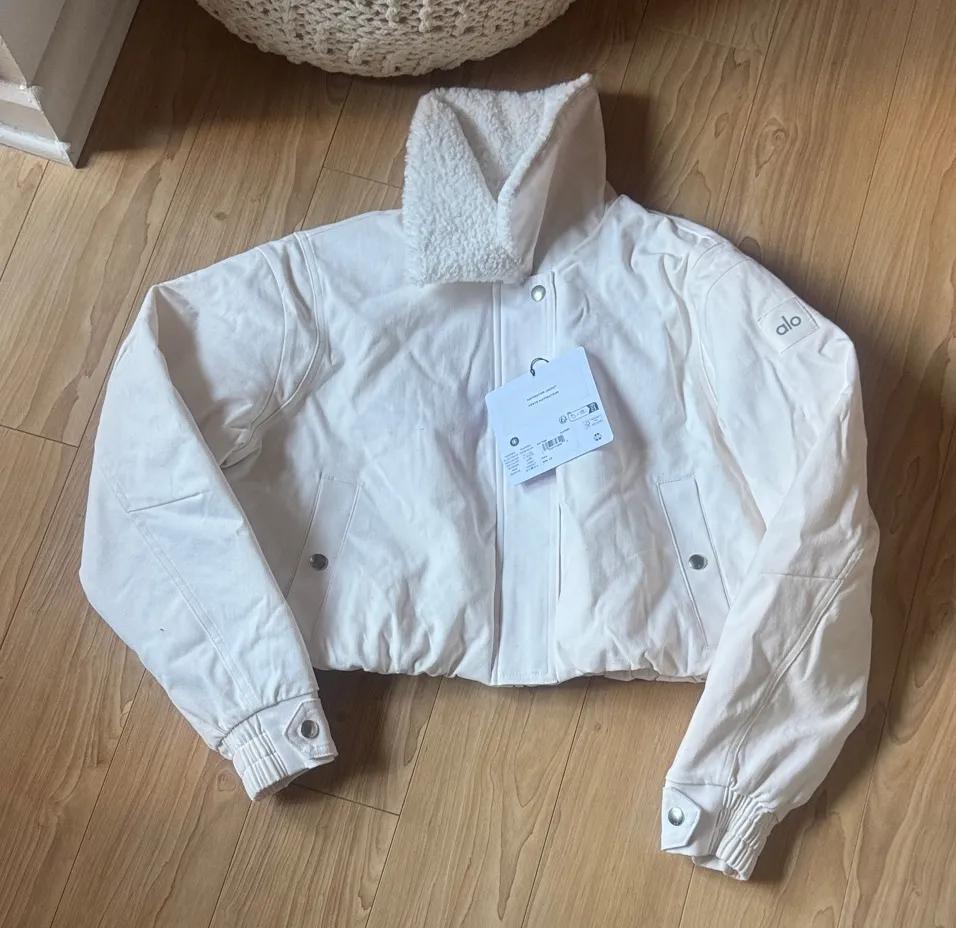 Stylish white cropped jacket with a cozy collar. Features Alo logo on the sleeve.