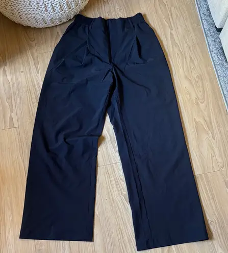Chic black pants. Wide-leg design. Comfortable waistband. Ideal for yoga or lounging.