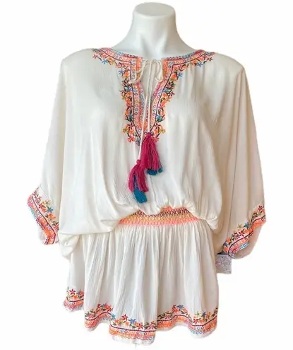 Altar’d State -Swimsuit Cover or Wear As A Blouse -Cream w/Multi Colored Embroidery -V-Neck w/ Tassl... Show more