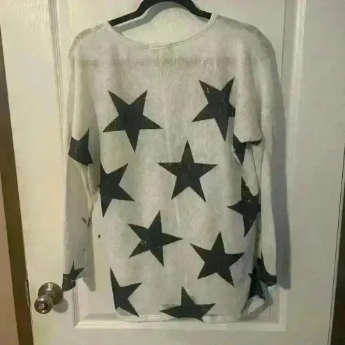 Super light weight sweater with cute dark grey stars on it and longer in the back! Great fall transi... Show more