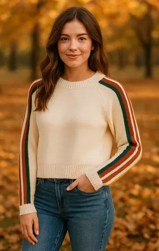Altar’d State rainbow sweater, cream knit top, striped sleeve sweater, boho cozy sweater, fall sweater, rainbow stripe pullover, cropped knit, crewneck sweater, colorful sleeve jumper, trendy retro sweater, Altar’d State women’s top, cozy boho fall outfit, soft acrylic sweater, cream rainbow knit, warm fall fashion, multicolor stripe sweater, casual fall outfit, retro rainbow stripe, comfy cream sweater, bohemian style top.