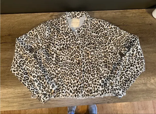 Chic leopard print denim jacket with button-up design. Features a classic collar. Ideal for casual w... Show more