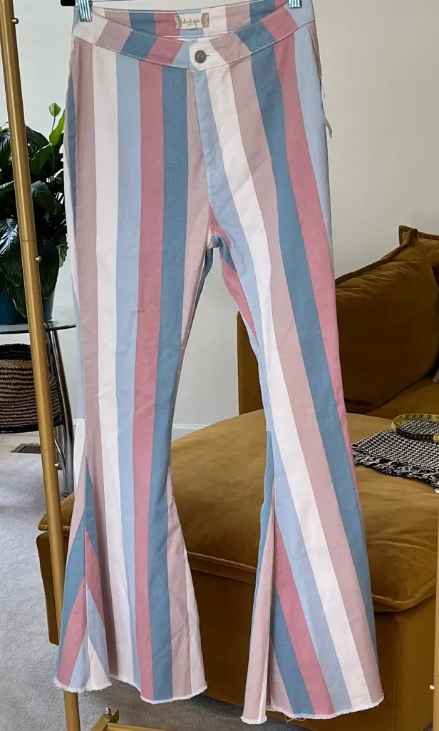 Chic flare pants with stripes. NWT Cotton and spandex blend. Waist 14” Rise 11” Inseam 32.5” Bin R