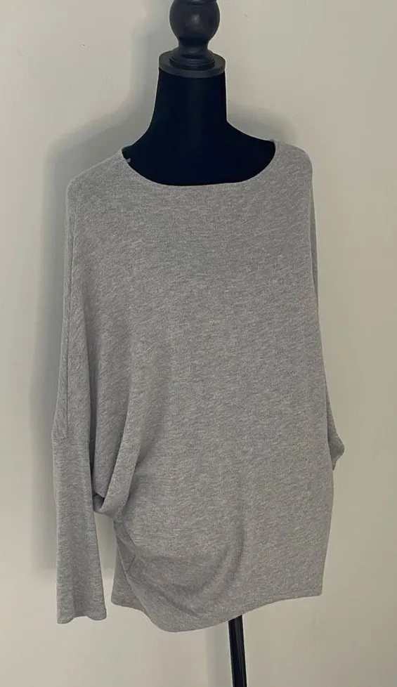 Description: This is a basic light gray sweater with oversized dolman style sleeves. Polyester/rayon... Show more