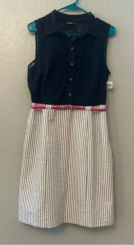 Alyx brand dress perfect for the office Navy blue Aztec looking lace top with buttons and collar Skirt is blue and white striped Belted at waist with bright pink belt Size 10 Approximate lay flat measurements: Armpit to armpit 17 inches across Shoulder to hem 37 inches No issues with dress, belt has some cracking Material: skirt: 63% cotton 37% polyester Bodice: 100% polyester Lining: 100% polyester