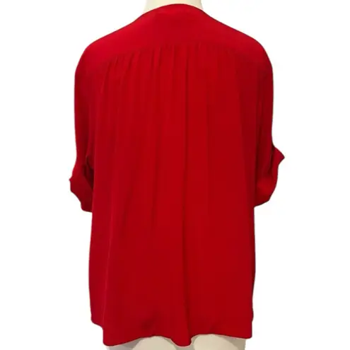 A lightweight bright red silk V neck top with rolled sleeves with tabs and gold-toned buttons. Suitable for business or pair with jeans for a more casual look.