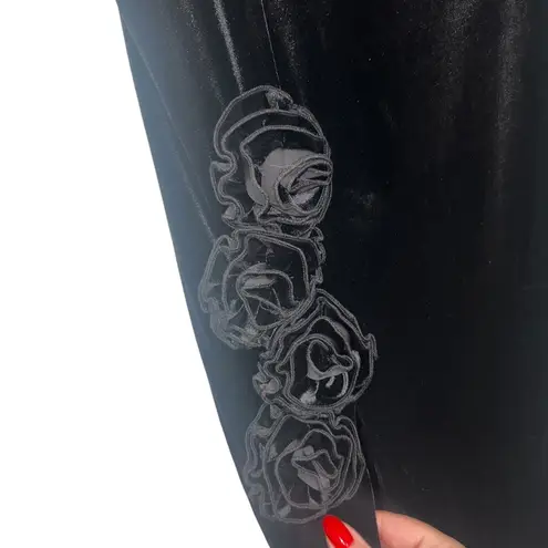 is such a stunning piece! This strapless velvet gown has a rosette embellished side slit and a boned... Show more