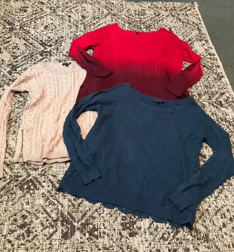 Americian eagle sweater bundle small. Blue with lace, red and maroon sweater, tan/beige sweater. All... Show more