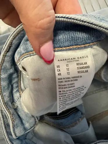 Light wash, distressed boyfriend jeans. Looser fit in legs but fitted in hips/rear. Some wear from u... Show more
