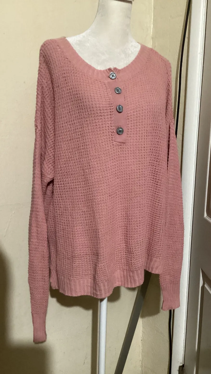 No flaws Measurements: • Bust: 28 in • Length: 24 in • Sleeve Length: 22 in Style: Henley Department: Women Material: Acrylic, Cotton Blend Neckline: Scoop Neck Sleeve Length: Long Sleeve Type: Sweater Features: Lightweight, All Seasons, Breathable Pattern: Solid Sleeve Type: Raglan Sleeve Fabric Type: Knit Accents: Button Knit Style: Waffle-Knit Season: Spring, Fall Fit: Relaxed Keywords: American Eagle, pink sweater, waffle knit, button neck, pullover, long sleeve, casual, cozy, lightweight, fall fashion, womenswear, basic, loungewear