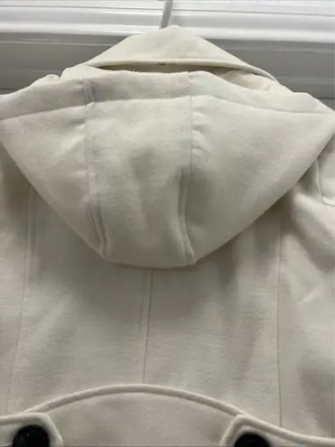 Chic and cozy ivory peacoat by American Rag Cie, featuring a classic double-breasted design with black buttons and a detachable hood. Soft wool-blend texture, side pockets, and back belt detail for a flattering fit. Perfect for fall and winter, pairs beautifully with jeans, dresses, or boots. Details: • Brand: American Rag Cie • Color: Ivory / Off-White • Size: M (Medium) • Style: Double-Breasted Peacoat with Hood • Material: Wool-blend (soft and warm feel) • Features: Side pockets, black buttons, back belt detail • Condition: Excellent pre-owned condition, clean and well cared for • RN 38847 | Style 4409SF