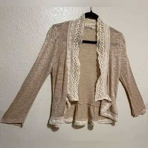 Stylish beige open front cardigan featuring delicate lace trim. Perfect for layering. Pit to pit is... Show more