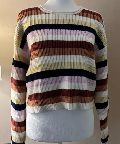 Stylish cropped crew neck long sleeve sweater with multicolor stripes. Features ribbed texture. Perf... Show more