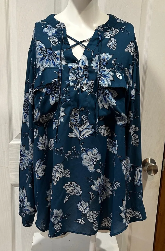 a.n.a Teal Floral Lace-Up Blouse Blue Size undefined - $10 - From Lucy